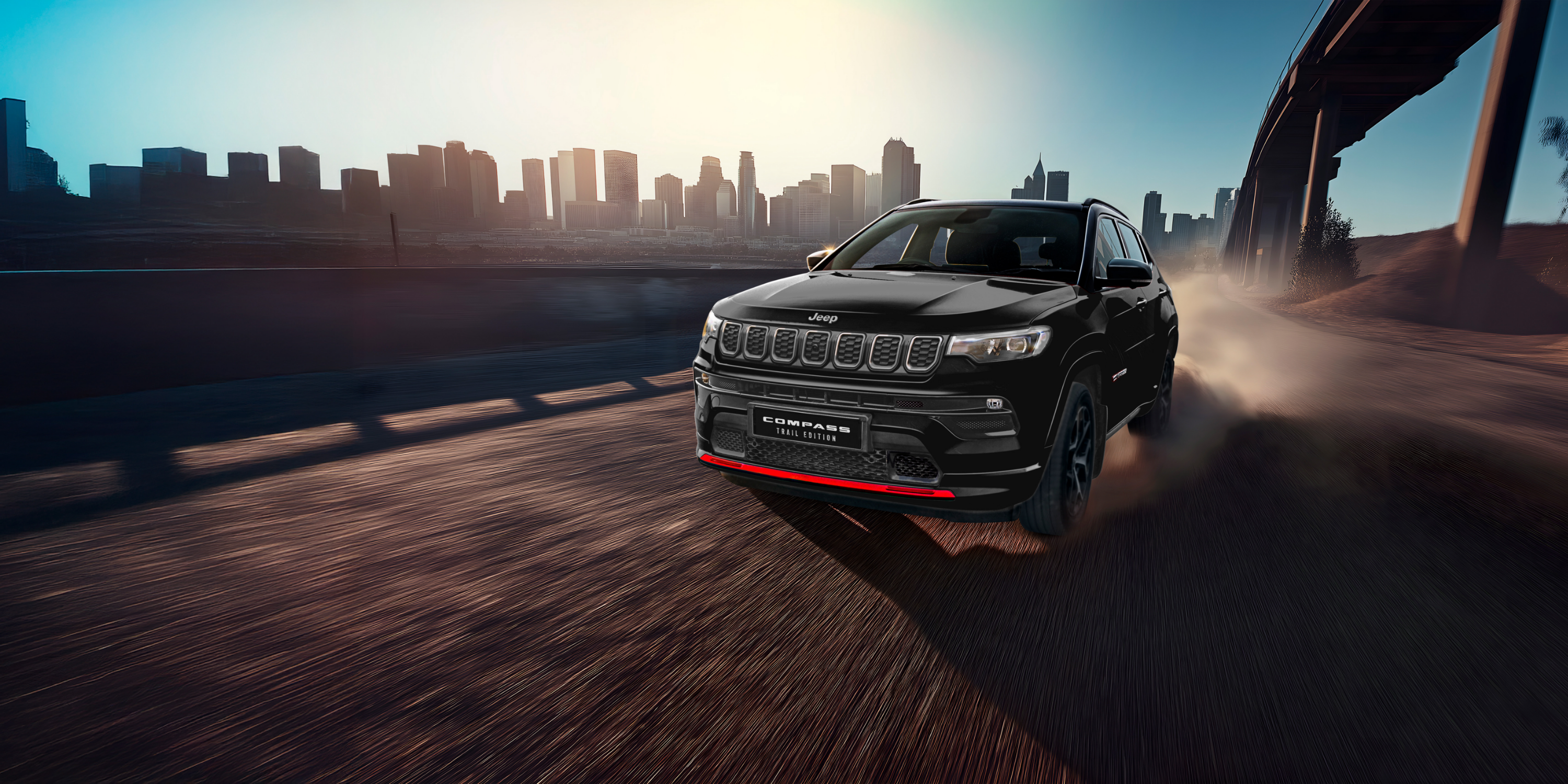 今年9月に発表されたCommander Trail Editionに続き、このたび登場する限定車が「Jeep® Compass Trail Edition」です。ブラック&グレーを基調としたボディに鮮やかなレッドのアクセントを配したスタイリングが最大の特長で、特にフロントフェイシア下部(フロントバンパー下部)に施されたレッドアクセントは、道行く人々の注目を集めることでしょう。